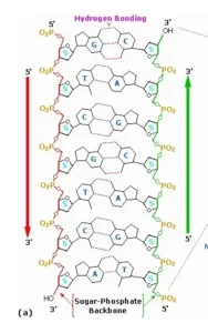 - The bases in two strands are paired through hydrogen bond (H-bonds) forming base pairs (bp). Adenine forms two hydrogen bonds with Thymine from opposite strand and vice-versa. Similarly, Guanine is bonded with Cytosine with three H-bonds.