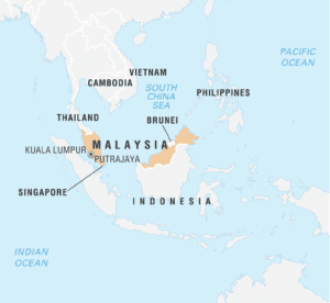 - Malaysia consists of two non- contiguous regions i.e., peninsular Malaysia (West Malaysia) located in Malay Peninsula bordering South China Sea in the east.
