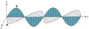 The adjacent figure shows a linearly polarized electromagnetic wave propagating in the z-direction with the oscillating electric field E along the x direction and the oscillating magnetic field B along the y-direction. | ![]() |