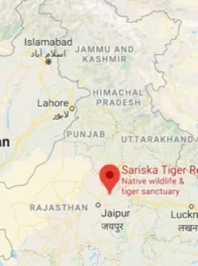 - Location: Sariska Tiger Reserve is located in the Aravalli Hills, 35 km from Alwar, 250 km SW of Delhi and 110 km NE of Jaipur. It lies in Alwar district of Rajasthan. It was declared as a Tiger reserve in 1978.