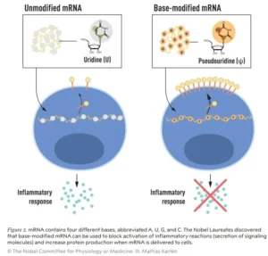 - They found that inflammatory response was almost abolished when base modification was included in the mRNA. Therefore, in 2015 they published that adjustments (modifications) to nucleosides, can keep the mRNA under the immune system’s radar.